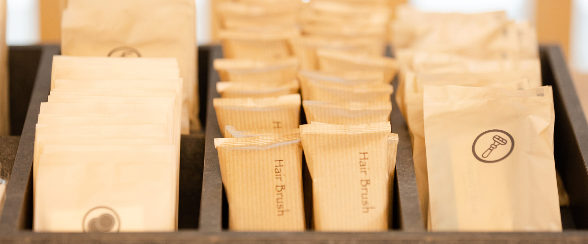 クロスホテル京都では、ORIX HOTELS & RESORTSのサステナビリティポリシーに基づき、自然環境の負荷低減につながるさまざまな取り組みを推進しております。このたび、令和4年4月1日施行の「プラスチックに係る資源循環の促進等に関する法律」を受け、一層の努力をするとともにプラスチック製品削減の観点から、法律にて使用の合理化を求められた特定プラスチック使用製品であるアメニティについて、ご提供方法を変更し、1階フロントロビー「アメニティバー」にてご用意しています。